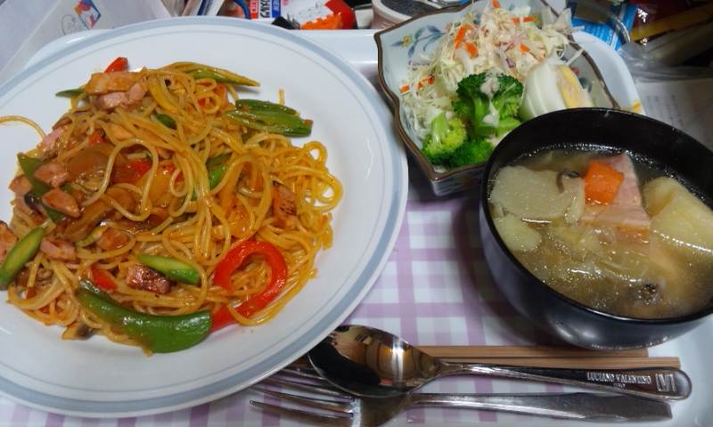 主食:スパゲティナポリタン。乾麺茹でて、市販のナポリタンソース…じゃつまらないので、冷蔵庫から引っ張り出したベーコン、買ってきたきのこ2種類(マッシュルーム&しめじ)、サラダ用に茹でておいたアスパラ、スナップエンドウ、パプリカ(赤&オレンジ)をバター&オリーブオイルで炒めてからナポリタンソースをフライパンにイン、更にゆでたスパゲティをインでなじませてみた。それにしても、結束パスタ1束100gは多い。80gくらいでいいのになあ。