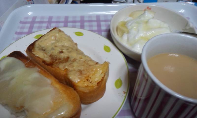 今日は休日に着きダラっと遅起き。そんでダラっと朝のブランチ。トースト2種類(ツナマヨ、チーズ)にカフェオレ、バナナヨーグルトの蜂蜜がけ。…だらだら食べ終わったのに、旦那がまだ寝てござる…