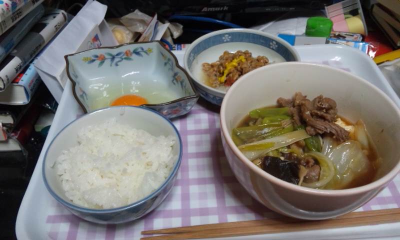 今日はすき焼き~。鍋のボリュームが大なので&生卵追加なので、その他はご飯と納豆のみ。納豆は大根おろしと梅干しをトッピング。…梅干しが終了したので買ってこなくては…。