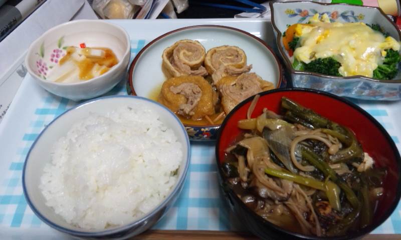 菜1:クックパッドにあった「あげトンまきまき」をうろ覚えで…というか、油抜きした油揚げに豚肉をまくまでは覚えてたんだけど、煮汁の配合全く覚えてなかったのでめんつゆと水を「煮物」配合で煮汁作ってそこにイン。…めんつゆメーカーさん、ラベルに書いておいてくれてありがとう!