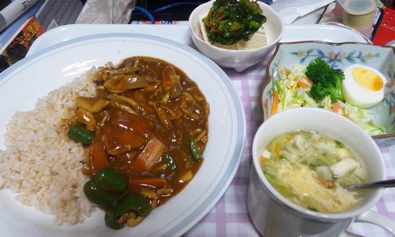 一汁:お味噌汁。本日の具は、大根、にんじん、白菜、ひらたけ。…なんか一味足りないと思ったけど、具材が水っぽかったので味噌の量が相対的に不足したってこと?それともネギがなかったから?…それとも油揚げか何かでコクを出すべきだった?