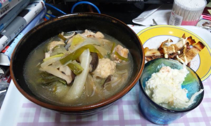 一汁:クリームシチュー。ルウは市販の箱入りのやつ、鶏むね肉とにんじん、じゃがいも、玉ねぎ、仕上げに茹でたブロッコリーも入っております。具を大きくしたからボリュームがあって幸せ~。鍋に一つ作ったので残りもあって幸せ~。