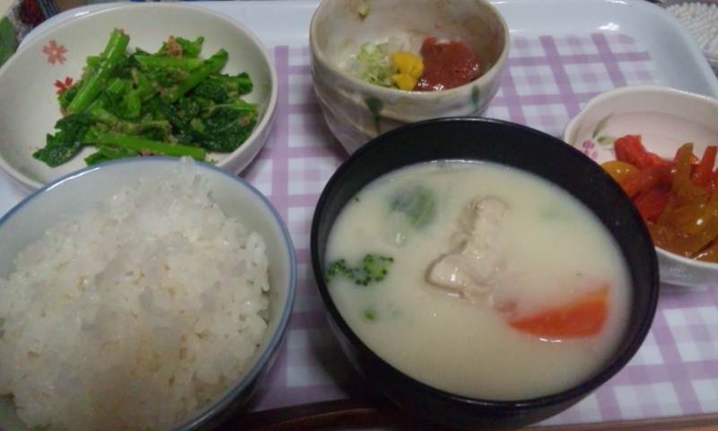 鶏むね肉が100g38円~!と飛びついて買ったものの、何もせずに週末。そんなわけで鶏むね肉消費メニューはシチューだ!これならしっかり食べられる&旦那の夜食にも朝食のお供にも使い回しOK!そんな一汁三菜。