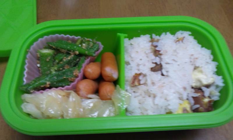 主食:白ご飯2分の1合250キロカロリー。栗ご飯?朝の温かいうちに3分の1はお弁当に、あとの3分の2は盛りつけて食べてしまったさ!