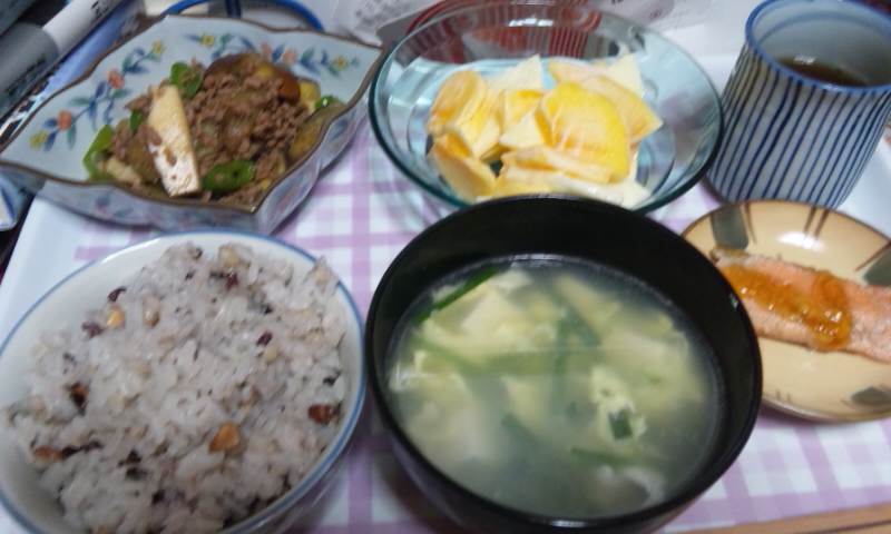 一汁:スタンダードにお味噌汁。これまたスタンダードに豆腐とわかめ。豆腐があと1個、早めに使おう。