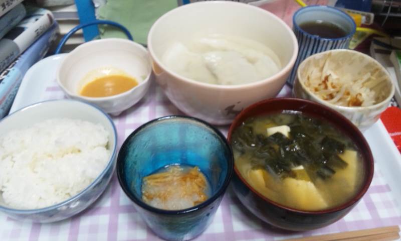 一汁:コンソメスープ。具はたまねぎとにんじんとキャベツ。野菜のみ、塩分控えめ狙いで塩コショウなし、でもまあ優しい味に仕上がったのでおいしくいただいた(つもり)。50キロカロリー以下に抑えたんじゃないかな。