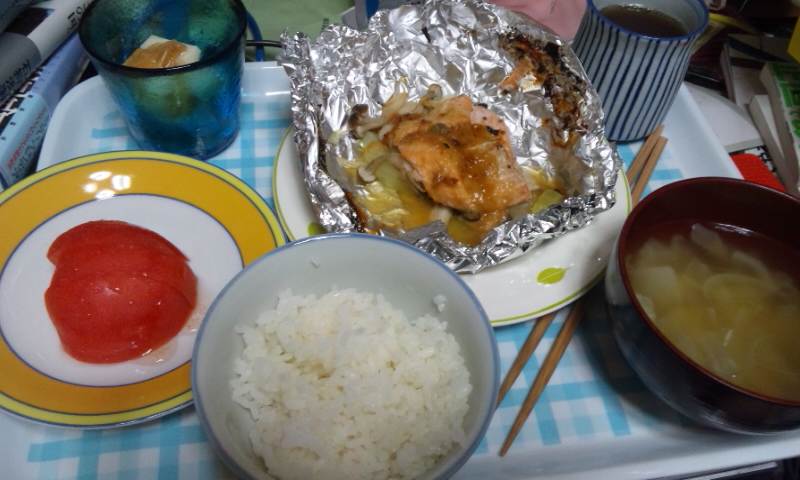 お弁当で使った生鮭の残り(2切れ入りなのに一切れの半分しか使ってない)が気になったので、今日はソレを使ってメイン。味噌バター焼きにしてみたので、スープはコンソメ系野菜増し増しで。そんな一汁三菜。
