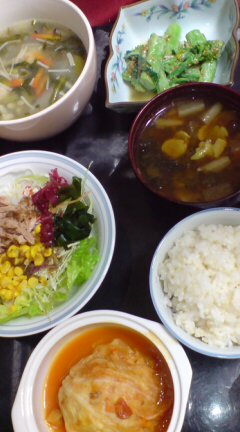 菜1:ロールキャベツ。ミネストローネのもと(レトルト希釈タイプ)で煮込んでみた。ドーム型のロールキャベツは大きいけどちょいと食べにくい…。