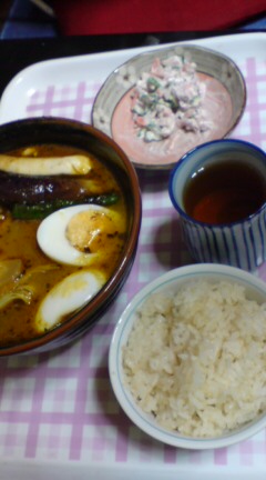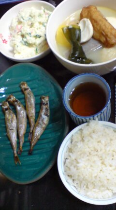 本日は昼間の余裕のある時間帯にお買い物。例によってお惣菜混じりの夕食だけど、のんびりできたからよしとする。そんな一汁3菜。